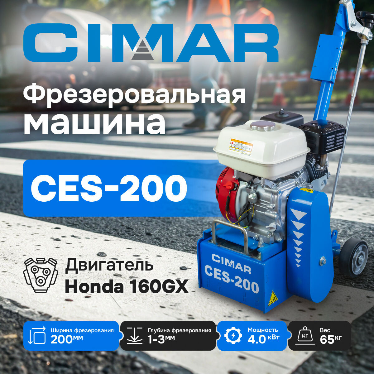 Машина оснащена бензиновым двигателем Honda GX160 мощностью 4 кВт (5,5 л.с.). Предназначена для работы с максимальной глубиной фрезерования до 3 мм и шириной обрабатываемого участка 200 мм. Габаритные размеры составляют 890×360×920 мм, вес машины — 60 кг.