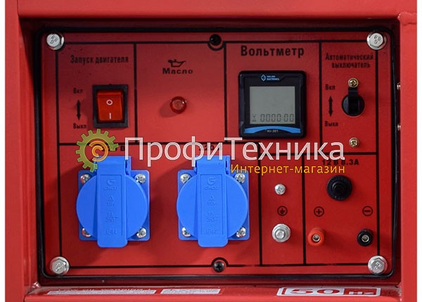 На панели управления расположены две однофазные розетки по 16А, кнопка останова, клеммы постоянного тока 12В, автомат защиты, счетчик моточасов с интегрированными вольметром и частотометром, а также лампа индикации низкого давления масла. Это позволяет легко контролировать работу электростанции и обеспечивает безопасность ее использования.