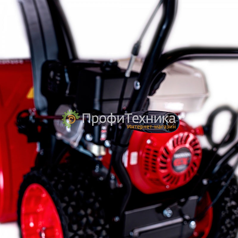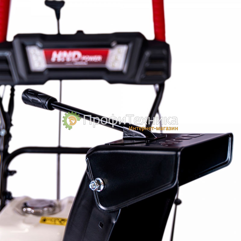 • На панели управления удобно расположены рычаг управления скоростью и направлением движения, а также кнопка включения фары и подогрева рукояток. Рычаг управления поворотом желоба реализован очень удобно через червячную передачу. Рычаг управления углом выброса расположен на желобе.