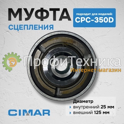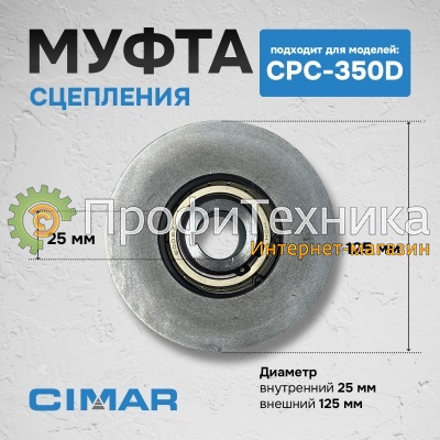 Данная муфта предназначена для установки на гидравлическую реверсивную виброплиту CIMAR CPC-350D с дизельным двигателем. Важно отметить, что эта муфта имеет иные геометрические параметры по сравнению с бензиновыми версиями: её внешний диаметр составляет 125 мм, а внутренний диаметр под вал двигателя — 25 мм. Эти размеры являются специфическими именно для дизельной модификации CPC-350D. Перед покупкой настоятельно рекомендуется сверить размеры с вашей старой деталью — установка муфты с несоответствующим внешним диаметром (например, 128 мм от бензиновых моделей) приведёт к невозможности корректного монтажа или к некорректной работе сцепления.