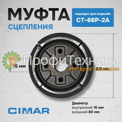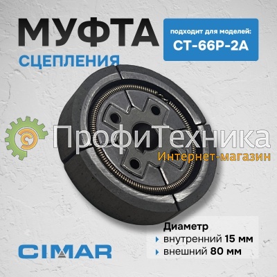 Данная муфта предназначена для установки на бензиновую вибротрамбовку CIMAR CT-66P-2A с двигателем Honda GX100. Её точные размеры: внешний диаметр — 80 мм, внутренний диаметр под вал двигателя — 15 мм. Это компактная муфта, характерная для малолитражных двигателей, и её габариты значительно меньше, чем у муфт для виброплит. Перед покупкой рекомендуется сверить размеры с вашей старой деталью — установка муфты с несоответствующим диаметром приведёт к невозможности монтажа или некорректной работе.