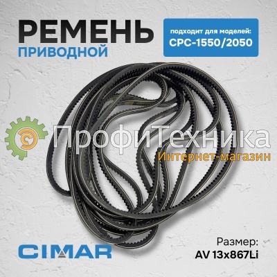Данный ремень предназначен для установки на прямоходные виброплиты CIMAR CPC-1550 и CPC-2050, обе из которых оснащены двигателем Honda GX160. Его точный размер — AV13x867Li. Расшифровка маркировки: AV13 — классический клиновой ремень с шириной 13 мм (обратите внимание: это AV13, а не AVX13, так как профиль может незначительно отличаться), 867Li — расчётная длина по внутренней стороне ремня в миллиметрах. На фото также видна маркировка производителя Zhejiang Sanwei Rubber Co., Ltd. — это известный китайский производитель, работающий по стандартам OEM для CIMAR.