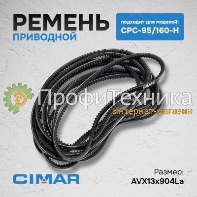 Данный ремень предназначен для установки на две модели виброплит CIMAR: CPC-95-H с двигателем Honda GX160 и CPC-160-H с двигателем Honda GX200. Его точный размер — AVX13x904La. Расшифровка маркировки: AVX13 — клиновой ремень с узким профилем и шириной 13 мм, 904La — расчётная длина в миллиметрах. Обратите внимание: этот ремень длиннее, чем на младшей модели CPC-60-H (у которого длина 836 мм), поэтому они не взаимозаменяемы. При замене важно использовать ремень именно с таким размером.